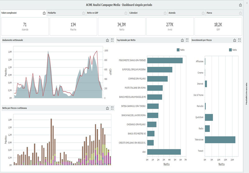 - - Analisi di scenario del totale mercato pubblicitario come rilevato e pubblicato da Nielsen, presenta una serie di cruscotti e report predefiniti con data visualisation e tavole dati che consentono una lettura analitica “a colpo d’occhio” delle informazioni relative agli ultimi 24 mesi definitivi con differenti livelli di sintesi o di complessità e confrontando i due ultimi anni mobili. È possibile applicare filtri per differenti elementi di classificazione, modificando interattivamente quanto rappresentato nei cruscotti e ottenendo una prima lettura veloce del totale o anche di parti del mercato raggruppando marche e aziende. È possibile esportare come oggetti grafici o come .pdf