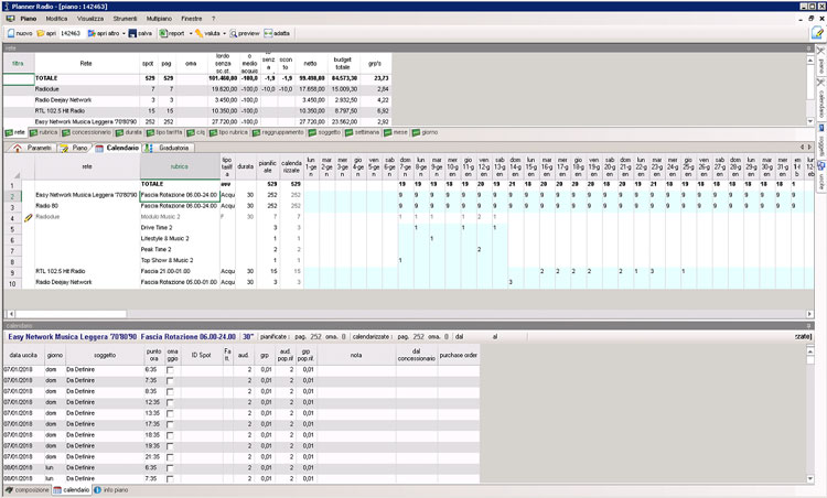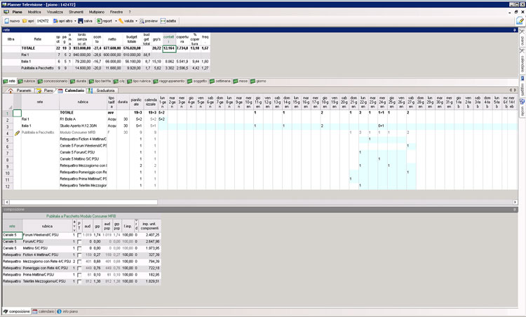 - dei clienti, dei prodotti e delle campagne con la possibilità di definire le durate dei flight, i mezzi da utilizzare, i vincoli di budget e di pressione pubblicitaria da sviluppare.