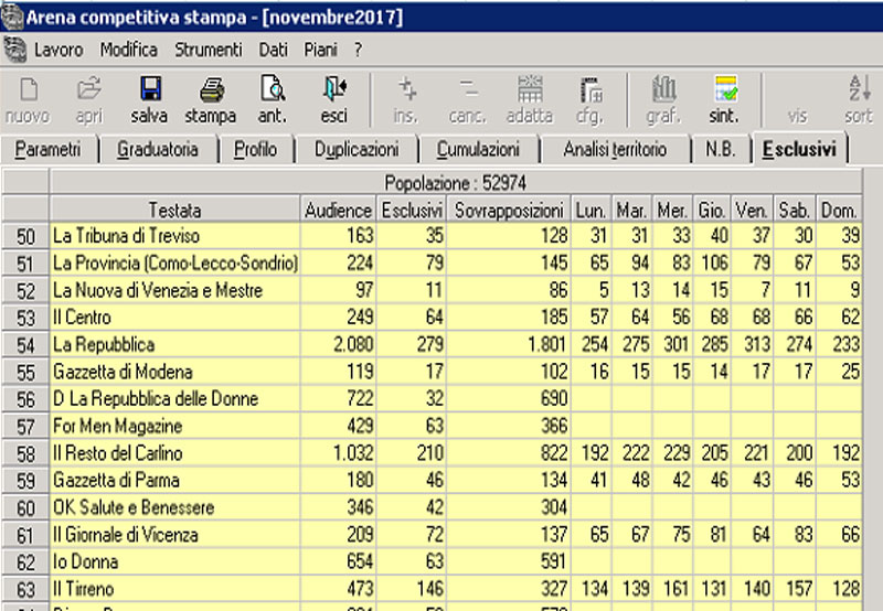 - Analisi Territorio: per ogni testata selezionata, copie diffuse e lettori a target per area geografica, regione e provincia.